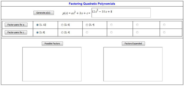 Instead, the tool found below simply presents the factor-pairs, the linear factors so determined, and the expansion of the products of these factors. It's my belief that a student struggling with the task of factoring a quadratic will more likely see the "pattern" in these calculations than in a tool that asks for the right answer and simply tells the student that the answer is right or wrong.