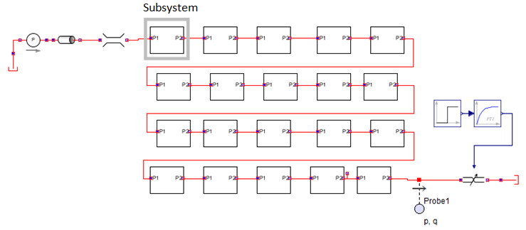 Figure 1 demonstrates a discretized pipeline in MapleSim with twenty nodes (the model can be downloaded here). Note the pressure source at one end, and the valve at the other end.