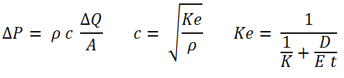 V(x,t) and P(x,t) are the velocity and pressure along the pipe, ρ is the liquid density, D is the pipe diameter, t is the pipe wall thickness, K is the liquid bulk modulus, E is the pipe Young’s modulus, and f is the friction factor.