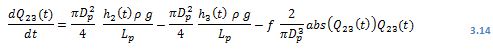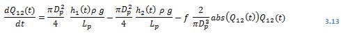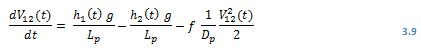 where P1(t) and P2 (t) are the pressures at the bottom of tanks 1 and 2, V12(t) is the liquid velocity, f is the friction factor, ρ is the liquid density, Lp is the length of the pipe, and Dp is the pipe diameter. The term associated with f is the pressure loss due to friction.