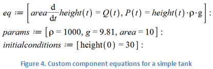 MapleSim does not have a tank component, but a simple model can be developed. The pressure at the bottom of the tank and the height of liquid in the tank are given by these equations