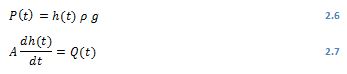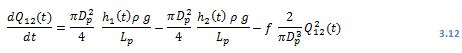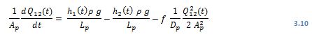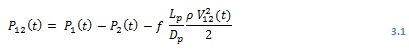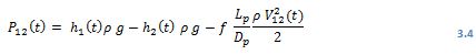 where P1(t) and P2 (t) are the pressures at the bottom of tanks 1 and 2, V12(t) is the liquid velocity, f is the friction factor, ρ is the liquid density, Lp is the length of the pipe, and Dp is the pipe diameter. The term associated with f is the pressure loss due to friction.