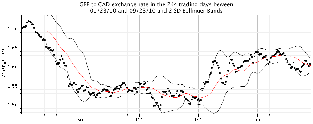 Again, most of the movement is within two standard deviations of the 20-day moving average.  However, it seems I should have changed a few British pounds to Canadian dollars three months ago, when the pound was particularly weak. Financial hindsight has always been one of my strong points.