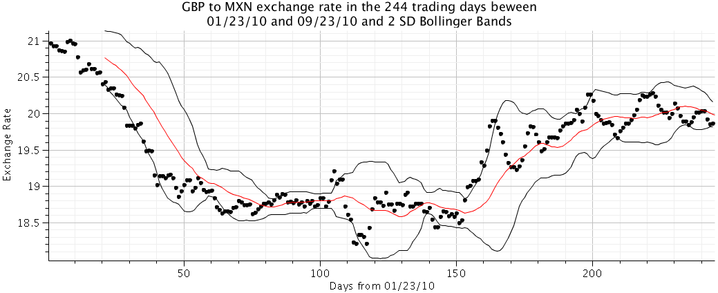 The plot also includes a 20-day moving average (the red line) and Bollinger Bands (the black lines), a tool used by technical traders as buy/sell indicators (along with a host of other markers).  Bollinger Bands give a trading range two standard deviations above and below the moving average, with most movement in this range.  Quite simply, if the exchange rate hits the upper band, it’s likely to fall, and vice versa.  Bollinger bands are most significant in a market that’s trading flat, while in a rising or falling market they follow the general trend.