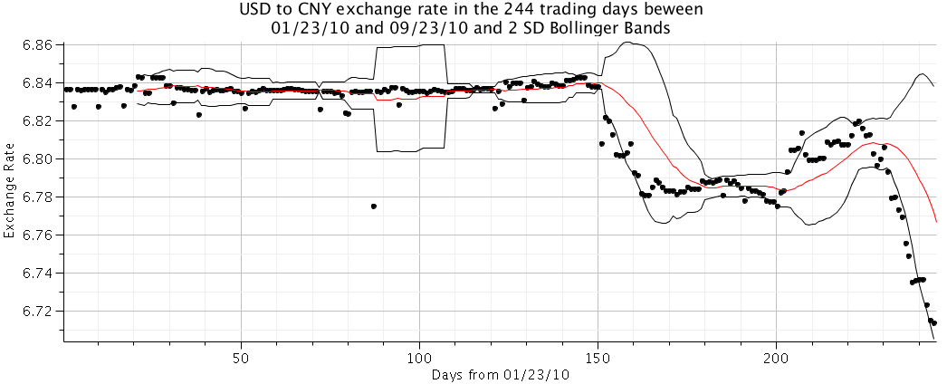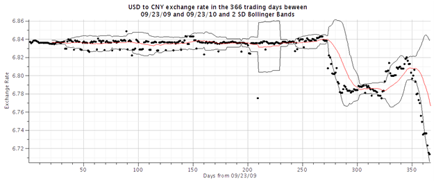 There's an outlier near Day 90, but that's probably just a mistake in the downloaded data.  At least for the majority of the year, the Chinese government pegged the exchange rate at around 6.84 Yuan to the US Dollar.  However, greater exchange-rate flexibility was announced in June, leading to a weaker Yuan and greater volatility. I might have missed the boat on changing GBP to CAD, but now might be the time to change my remaining Yuan into US Dollars.