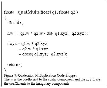 In the programming code, the traditional method for representing quaternion fractals is by only using the Reals (see figure 7 for a code snippet on how to multiply a quaternion). For the octonion fractal, there is one contravariant quaternion fractal nybble with one covariant quaternion fractal nybble. The w is the coefficient to the scalar component and the x, y, z are the coefficients to the imaginary components. For the sedenion fractal, there are two contravariant nybbles and two covariant nybbles. In the code, one needs to construct the sedenion fractals using the ordinary complex numbers isomorphic matrix rather than the Reals as elements. For the pathion fractal, there are four contravariant nybbles and four covariant nybbles. In the code, one needs to construct the pathion fractals using a quaternion isomorphic matrix as elements. Finally, for the chingon fractal, there are eight contravariant nybbles and eight covariant nybbles. Here, in the code, one uses a hypermatrix composed of a 4x4 hypermatrix containing quaternions matrices, as members, rather than the Reals. The quaternion matrices contain complex number matrices, rather than the Reals. Each nybble is not just a collection of points. Instead, each nybble is an actual quaternion in that particular hypercomplex space. These nybbles are allowed to morph as each of their components is varied. The most interesting feature of each nybble is the visual demonstration of the various Riemannian and Lobachevskian geometrical spaces of each nybble manifold.