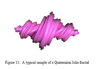 With the quaternion’s Julia fractals, both Alan Norton [9] and John C. Hart [6] held one of the four dimensions constant, while the other three dimensions are allowed to vary. Although one still cannot visualize four dimensions, using 4D quaternion Julia fractals allow one to build an intuitiveness on the nature of four dimensional space with real-time ray tracing and morphing. Even with the fourth dimension held constant there is a fifth dimension involved which is also allowed to vary, and that is time. Hence, with three space dimensions and one time dimension, four dimensions are still being visualized.