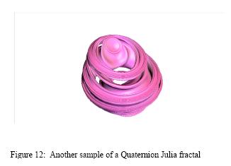 The father of fractal geometry is Benoit Mandelbrot (1924-), who is a French mathematician. Mandelbrot’s work [8] was inspired by another French mathematician named, Gaston Julia (1893-1978). The first fractal geometry rendering of a hypercomplex number, the quaternion (4D), was by two Americans in the 1980s, first Alan Norton [9] and then later by John C. Hart [6]. Fractal geometry takes advantage of the unique nature of the imaginary components of the ordinary complex numbers and hypercomplex numbers. Figure 11 and 12 show two typical samples of quaternion Julia fractals.