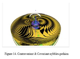Only where the slices meet at the extrema, is where both the contravariant and covariant cuts are equal. In a firstdegree calculus course, one uses a tool, such as a tangent line, to determine if the curve is increasing, decreasing, or at an extrema. Both the calculus and the contravariant/covariant technique provide visualization hints to the user. Nevertheless, when one move to dimensions higher than 3D, the calculus technique seems to fail us for providing visualizing aides. Yet, the contravariant/covariant technique is still programmable, by a computer, for aiding in visualizing. With 4D slices, one first has an abscissa space and ordinate space. Both spaces share the same abscissa hyper-plane. One shall call the abscissa hyper-plane the horizon, and thus a 4D cut parallel to the horizon is called the contravariant cut. One call each set of fours imaginary components a quaternion nybble (see figure 8, 9, and 10 for example of contravariant and covariant images).