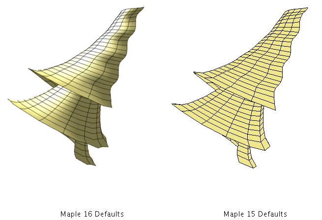 One of my coworkers brought in G.L. Legendre's book "Pasta By Design" (amazon.ca/dp/0500515808).  It is full of photographs and parametric equations for 92 shapes of pasta.  Of course, we had to set about plotting his equations in Maple.  Orginally I was going to post about this before Maple 16 came out, but I was struck with how much better plots looked in the Maple 16 pre-release and so I decided to wait.   As one example, here are the parametric equations for Giglio Ondulato noodles plotted using the default 3D plot settings in Maple 16 and Maple 15.