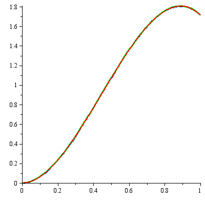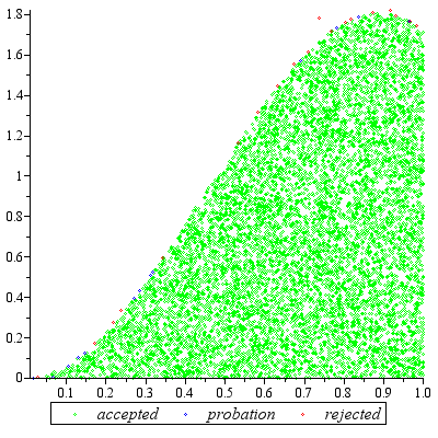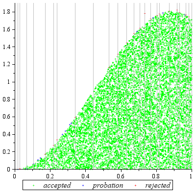 Maple uses a beautiful trick for this: it starts with the configuration as we have constructed it in the previous part of this post, and whenever it has to reject a sample value (a red point), or whenever it finds a "blue point" where the lower bound is at least 10% less than the value of , then it subdivides the interval containing that point, at that point. In this way, it is exactly in the areas where many red points would occur that Maple is most likely to adapt the shape of . The reason to start with the interval subdivided into subintervals so that is all convex or all concave on each subinterval is clear as well now: then there is a clear solution to how to derive an upper and lower bound if such a subinterval is to be split up.