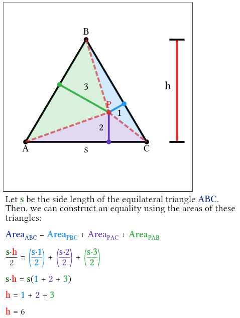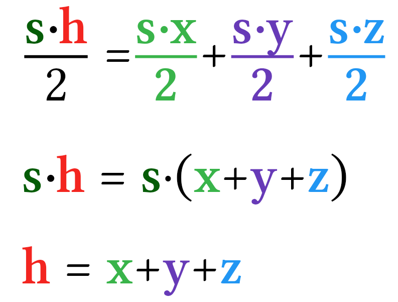 In words, the sum of these distances x+y+z is simply the height of the triangle, h, no matter where the point P lies inside the triangle.