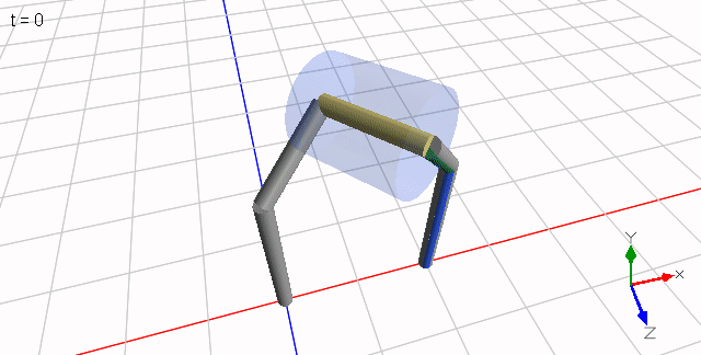A supplementary rigid body component without mass and rotational inertia is used at the center of mass of the three masses to impose initial conditions. Rotating the triangle at the start of the simulation about the center of mass of the 3 masses prevents the triangle from drifting laterally away from its initial position. This effect of lateral drift is visible in video footage from space with the T-handle.