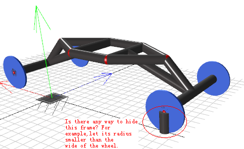 I use maplesim to construct a cart, which is controlled by a DC magnet. As the model in the document illustrated, the cart is drived by a prismatic, and there is a rigid body frame between the cart and the prismatic. This rigid body frame is used to sustain the cart. If delete the frame, wheels of the cart will descend bellow horizontal plant. This should be avoided. Is there any to to hide this sustain frame?
