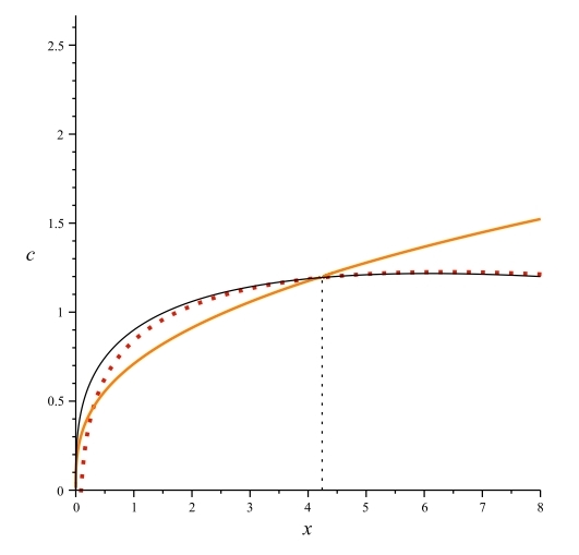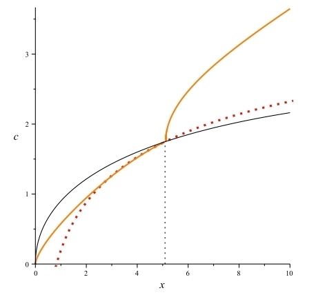 I plot the resulting solutions in the (x,c) plane. The orange line is the trajectory that converges to the critical point (xss,css,qss). The dotted red trajectory is the center manifold approximation. They should coincide near a neighborhood of the critical point.