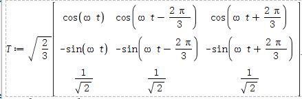T := Typesetting[delayDotProduct](sqrt(2/3), Matrix(3, 3, {(1, 1) = cos(omega*t), (1, 2) = cos(omega*t-(2/3)*Pi), (1, 3) = cos(omega*t+(2/3)*Pi), (2, 1) = -sin(omega*t), (2, 2) = -sin(omega*t-(2/3)*Pi), (2, 3) = -sin(omega*t+(2/3)*Pi), (3, 1) = 1/sqrt(2), (3, 2) = 1/sqrt(2), (3, 3) = 1/sqrt(2)}), true)