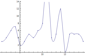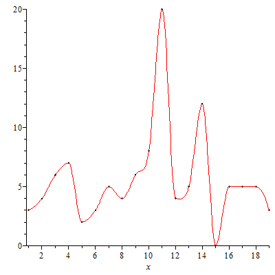 Show[Plot[ListInterpolation[L][x], {x, 1, 19}], ListPlot[L]]