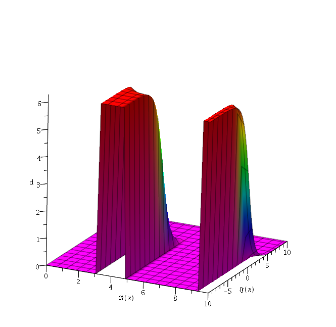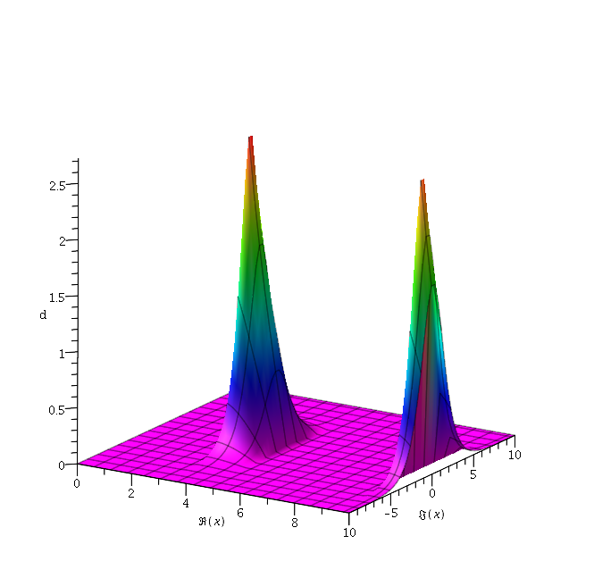 PlotExpression(d,x=-10*I..10+10*I,title="",labels=[Re(x),Im(x),"d"]);