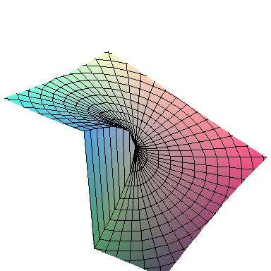 plot3d([Re(z), Im(z), Im(sqrt(z))], r = -3 .. 3, theta = 0 .. Pi, view = [-2 .. 2, -2 .. 2, -2 .. 2])