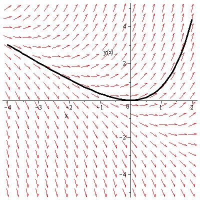 DEplot(diff(y(x), x) = x+y(x), y(x), x = -4 .. 2, y(x) = -5 .. 5, [[0, 0]], linecolor = black)