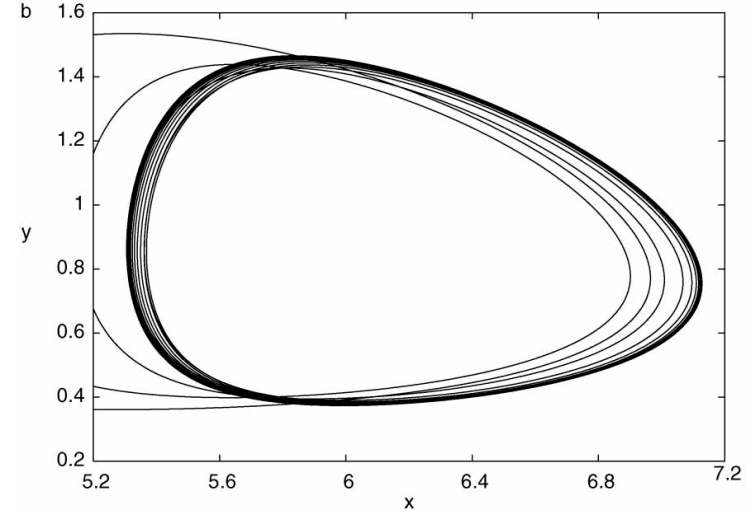 A:=DEplot([Eq1,Eq2,Eq3,Eq4,Eq5],[x(t),y(t),z(t),v(t),w(t)],t=0..140,x=5.2..7.2,y=0.2..1.6,initialset,stepsize=0.01,