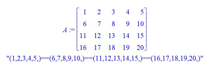 convert(cat(seq(op(["(", seq(op([convert(A[i,j], string), ","]), j=1..n), ")", "=="]), i=1..m-1), op(["(", seq(op([convert(A[m,j], string), ","]), j=1..n), ")"])), string);