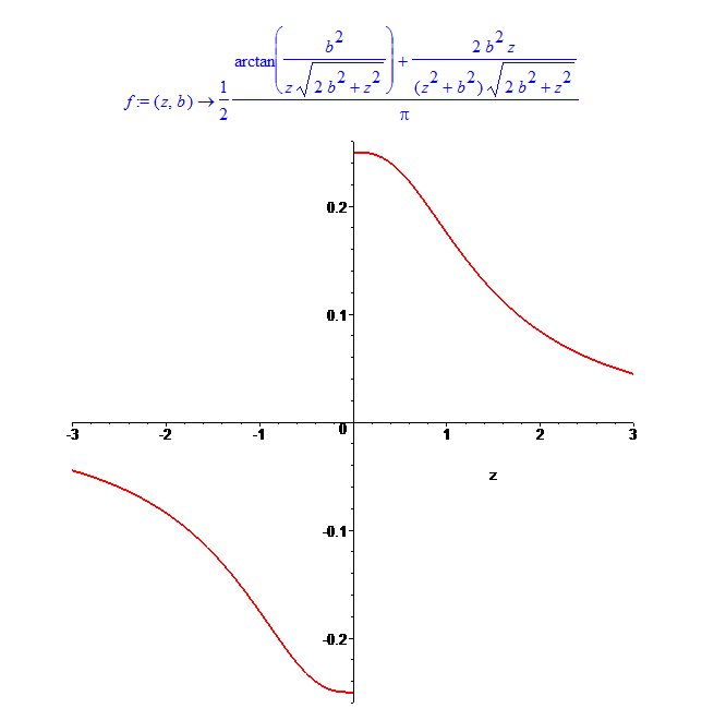 f:=(z,b)->(arctan(b^2/(z*sqrt(b^2+b^2+z^2)))+b^2*z*1/(z^2+b^2)+1/(z^2+b^2))/sqrt(b^2+b^2+z^2))/(2*Pi):