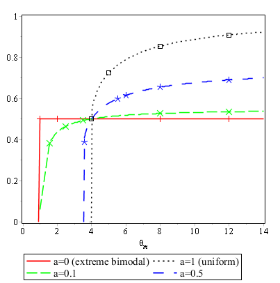 p1 := plot(piecewise(`and`(theta[m] > .9, theta[m] < 1), 5*theta[m]-4.5, theta[m] > 1, x(0)), theta[m] = .9 .. 14, color = red, legend = "a=0 (extreme bimodal)"):