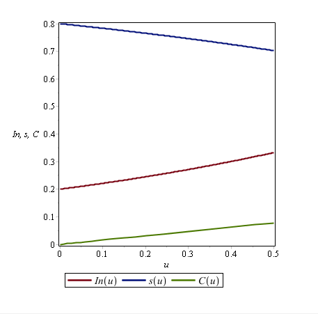 plots[odeplot](dsys, [[u,In(u)], [u,s(u)], [u,C(u)]], u = 0 .. 0.5, thickness=2, axes = boxed, legend=[In(u),s(u),C(u)]);