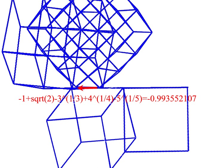 The following mess is a two dimensional projection of the segment, square, cube, tesseract, penteract and hexeract lined up not quite according to Diagram 3. The red segment should  represent 1-sqrt(2)+3^(1/3)+4^(1/4)-5^(1/5)+6^(1/6), but I'm not sure if I kept track of its possition altogether correctly.Furthermore, it is not necessarily to scale.