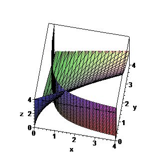 > plot3d([[x,1/x,z],[x,2*x/z,z]], x=0..4, z=0..4, view=[0..4,0..4,0..4], axes=box,