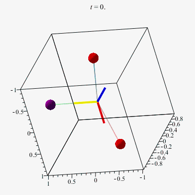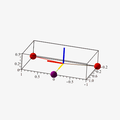 OriginalBody := display([point([1, -.2, 0], colour = red, symbolsize = 50, symbol = solidsphere), point([-1, -.2, 0], colour = red, symbolsize = 50, symbol = solidsphere), point([0, 1, 0], colour = purple, symbolsize = 50, symbol = solidsphere), line([0, 0, 0], [1, -.2, 0]), line([0, 0, 0], [-1, -.2, 0]), line([0, 0, 0], [0, 1, 0]), line([0, 0, 0], [.5, 0, 0], colour = red, thickness = 4), line([0, 0, 0], [0, .5, 0], colour = yellow, thickness = 4), line([0, 0, 0], [0, 0, .5], colour = blue, thickness = 4)], scaling = constrained)