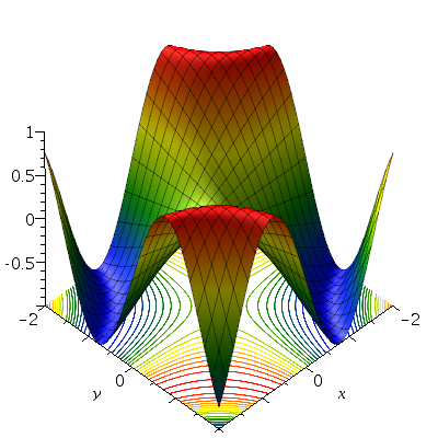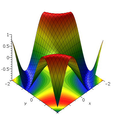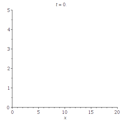 plot3d([x,t,u], f=-5..5, t=-5..5, grid=[251,251], style=surface);