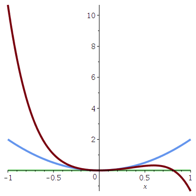plot({0, 2*x^2, 2*x^2 - 2*x^3 + 8/3*x^4 - 4*x^5},