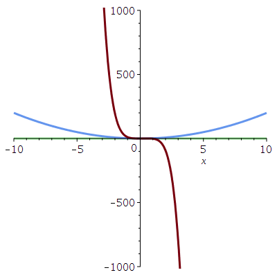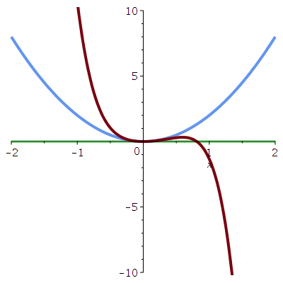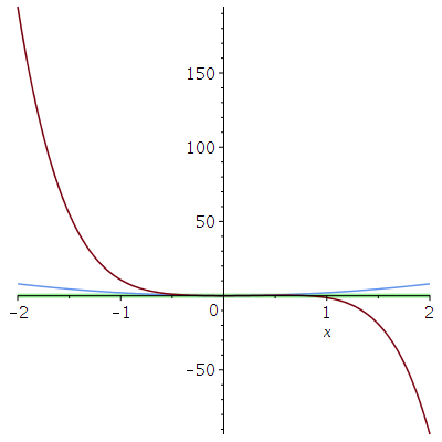 plot([0, 2*x^2, 2*x^2 - 2*x^3 + 8/3*x^4 - 4*x^5], x = -2 .. 2,