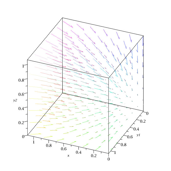 plots:-fieldplot3d(RHS, x = 0.1e-6 .. 1, y1 = 0 .. 1, y2 = 0 .. 1, grid = [7, 7, 7], axes = boxed, fieldstrength = average)