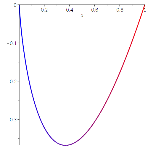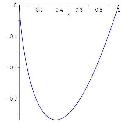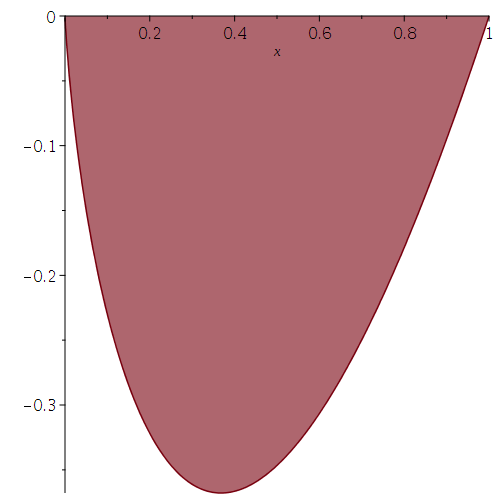 plot(x*ln(x), x=0..1, filled);
