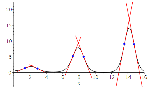 T := seq(plot(df(p)*(x-p)+f(p), x=p-1..p+1), p=Inflpts):
