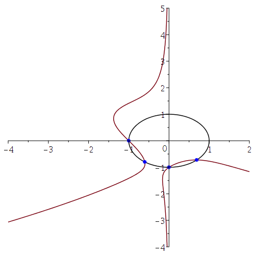 temp := fsolve([H(x,y)=0, x^2+y^2=1], {x=-4..2, y=-4..5}