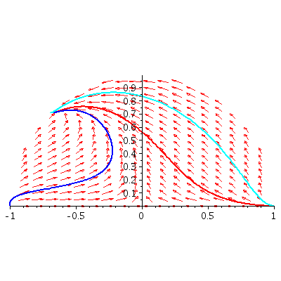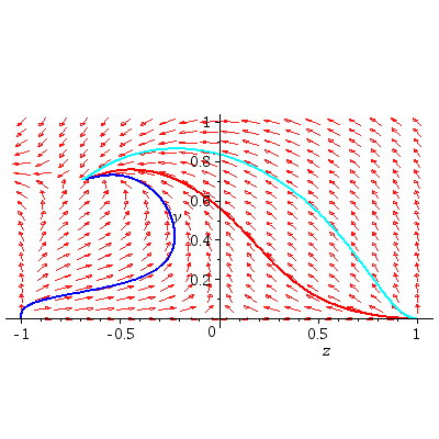 P := DEplot(sys11, [z(t), y(t)], t = -7 .. 7, z = -1 .. 1, y = 0 .. 1, [ics1, ics2, ics3], linecolor = [red, blue, cyan], stepsize = 0.1e-1, thickness = 2, arrows = medium):