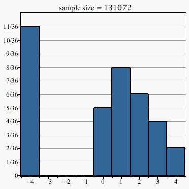 Histogram(S, ':-binbounds'=[seq( j+1/2, j=min(S)-1..max(S))],