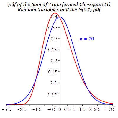 title = `pdf of the Sum of Transformed Chi-square(1)\nRandom Variables and the N(0,1) pdf`,