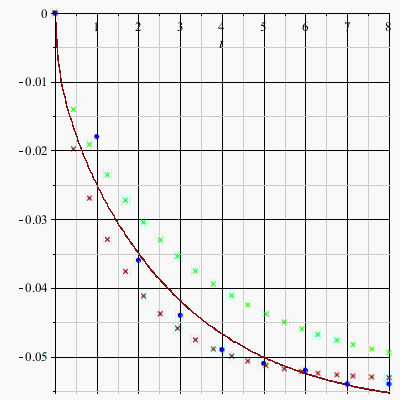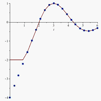 plot0 := plot(k__plot(0.78e-1, 3*10^(-2), t), t = 0 .. 8); plots:-display(plot0, plot(`<|>`(X1, Y1), style = point, symbol = solidcircle, color = blue))
