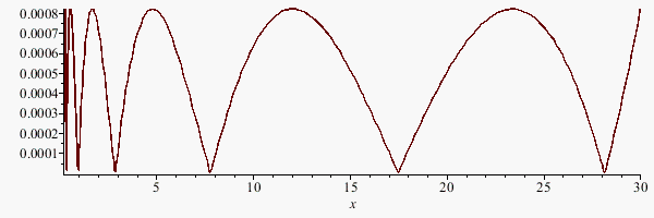 plot(abs(LambertW(x)-ans),x=0.3..30,