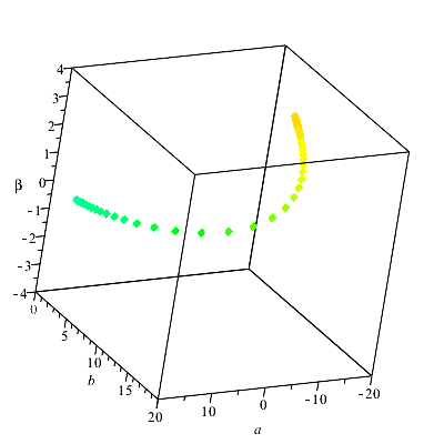 I made a few modifications to the ranges of the variables, as passed to fsolve. Judging from the piecewise functions it seemed to make sense to bound n1 by -4 from below, so as to not waste time in fsolve's search. It wasn't clear to me whether you wanted to get the points that lay along some single spacecurve (as n1 changed), but since there might be other solutions I restricted beta by -2 from below. And I extended the lower bound of `a` to -20, as it seems to extend the curve nicely.