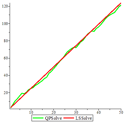 The LSSolve result is not necessarily higher. It's higher because you chose a value of ER=10, which is used only to fill y the target for the least-squares fit. It fits to target data, by minimizing error. Give it an ad hoc target, and get an ad hoc result. Why shouldn't the LSSolve result depend on your arbitrary ER value?