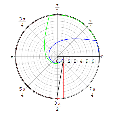 polarplot([r(phi, 0, 0), r(phi, .48, 0), r(phi, 3, 0), r(phi, 4, 0)], phi = -2*Pi .. 0, color = [red, black, green, blue])