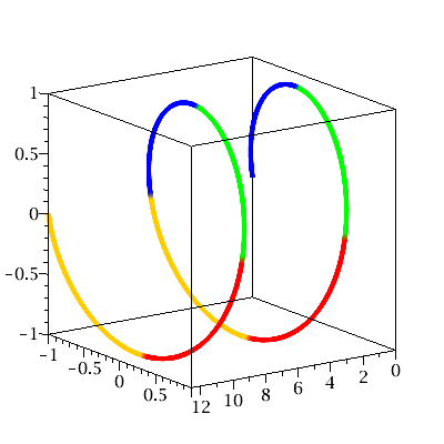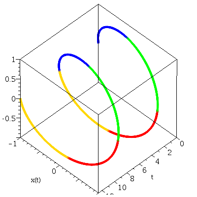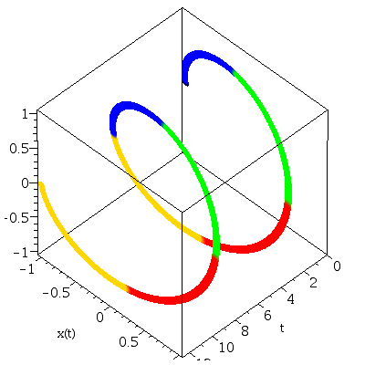 SpaceCurve([t, X(t), V(t)], t=0..4*Pi, colorfunc=cfunc,