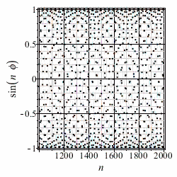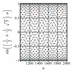 P := plots:-pointplot([seq([n, sin(n*phi)], n = 1000 .. 2000)],