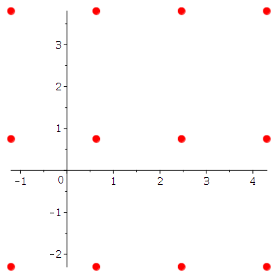 [[-1.2, -2.3], [.633333333, -2.3], [2.466666666, -2.3], [4.299999999, -2.3], [-1.2, .750000000], [.633333333, .750000000], [2.466666666, .750000000], [4.299999999, .750000000], [-1.2, 3.800000000], [.633333333, 3.800000000], [2.466666666, 3.800000000], [4.299999999, 3.800000000]]